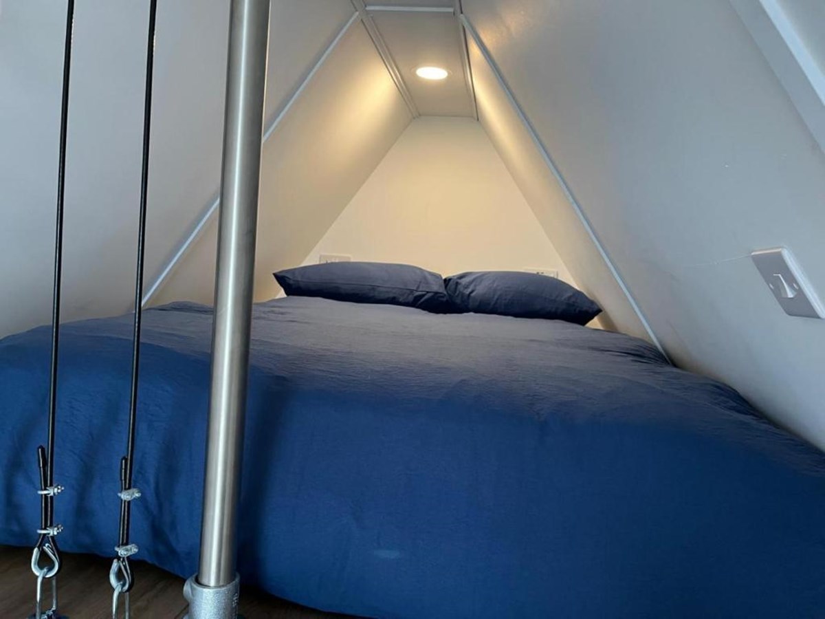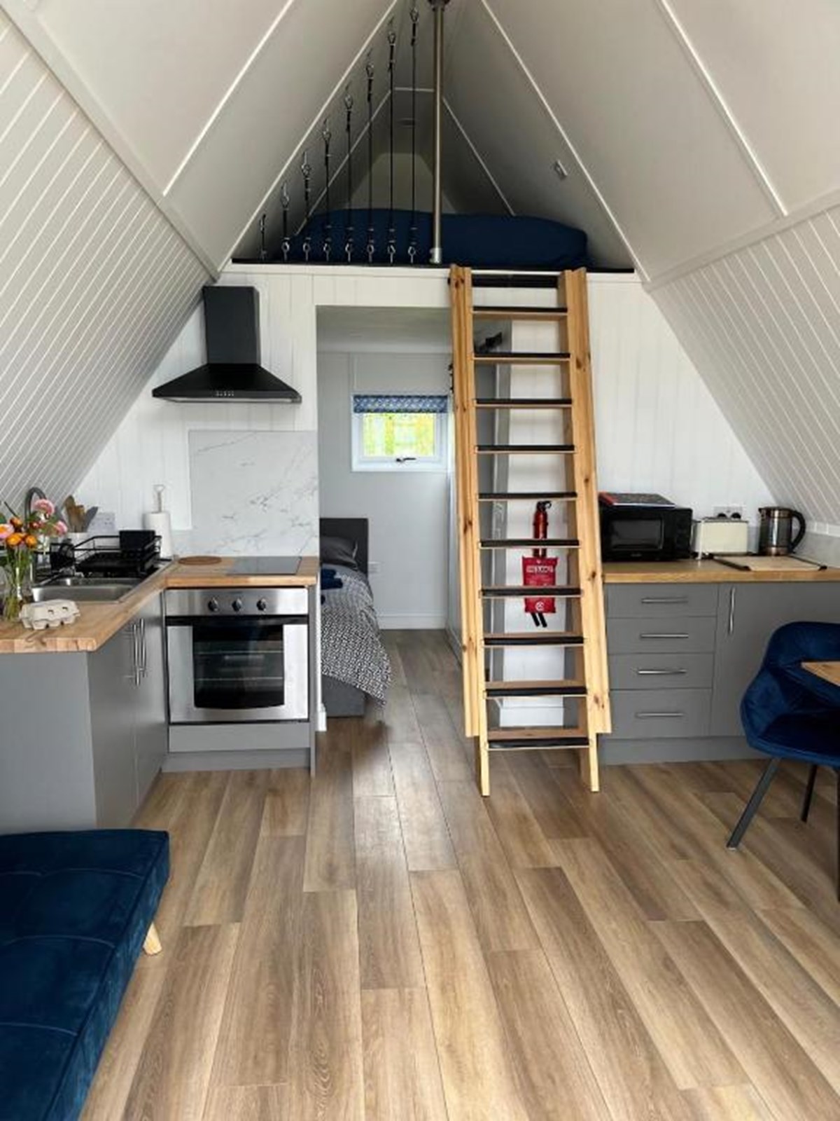 With one double bedroom and a mezzanine deck the tiny home can comfortably sleep four, with a sofa bed providing accommodation for an additional person if required. The stairs to the mezzanine are ladders, so young children should be accompanied at all times.